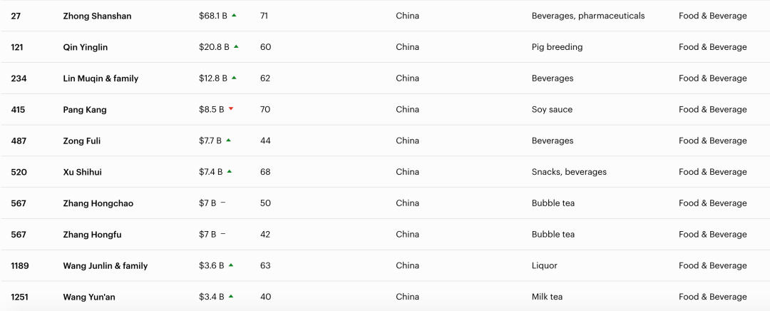 我们来重点看看食品饮料相关领域最靠前的一批富豪名单。