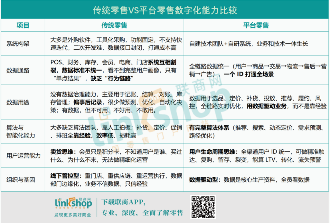 平台型零售依托全域大数据实现市场全局洞察,从选品、商品组合、动态定价到柔性供应链,全流程精准高效、迭代轻快;而传统零售多依赖局部经验与人工决策,选品被动滞后、商品结构陈旧僵化、供应链链路长且市场响应慢,普遍存在库存积压、运营效率低等问题。