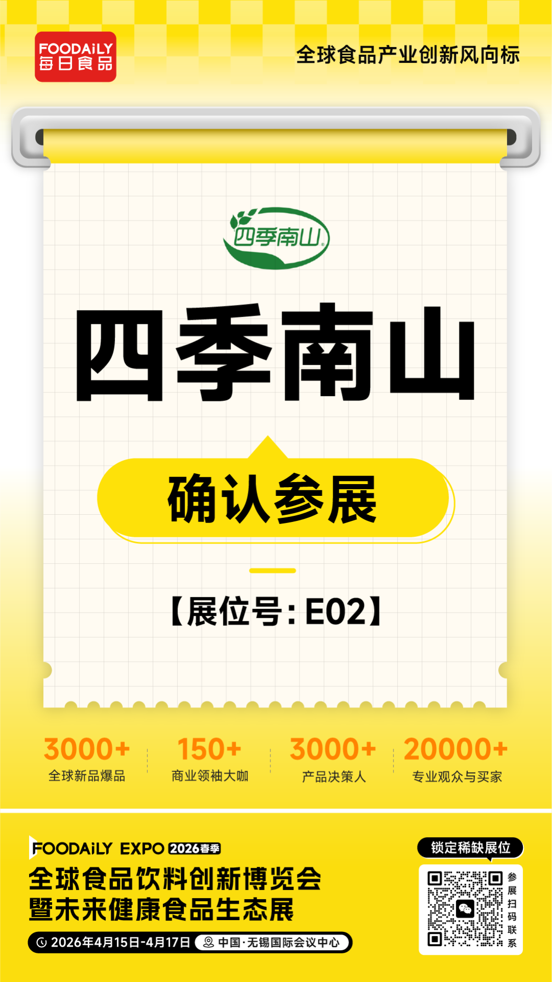 2026 Foodaily创新博览会,四季南山将携旗下明星产品矩阵亮相于无锡国际会议中心,E02展位,邀业界同仁共探精准营养创新方向。