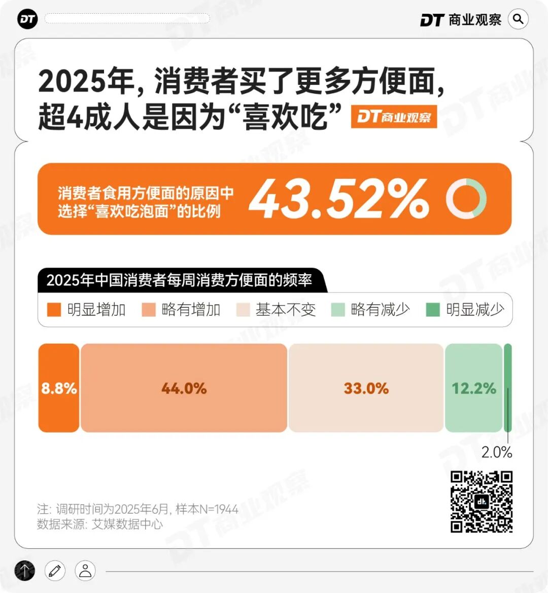 如果说,过去人们吃方便面主要是为了方便和充饥,是一种不得不的将就,现在,越来越多人则是主动选择。艾媒数据中心调研显示,过去一年,超过5成人增加了方便面消费频率,超过4成人吃泡面是因为“喜欢吃”
