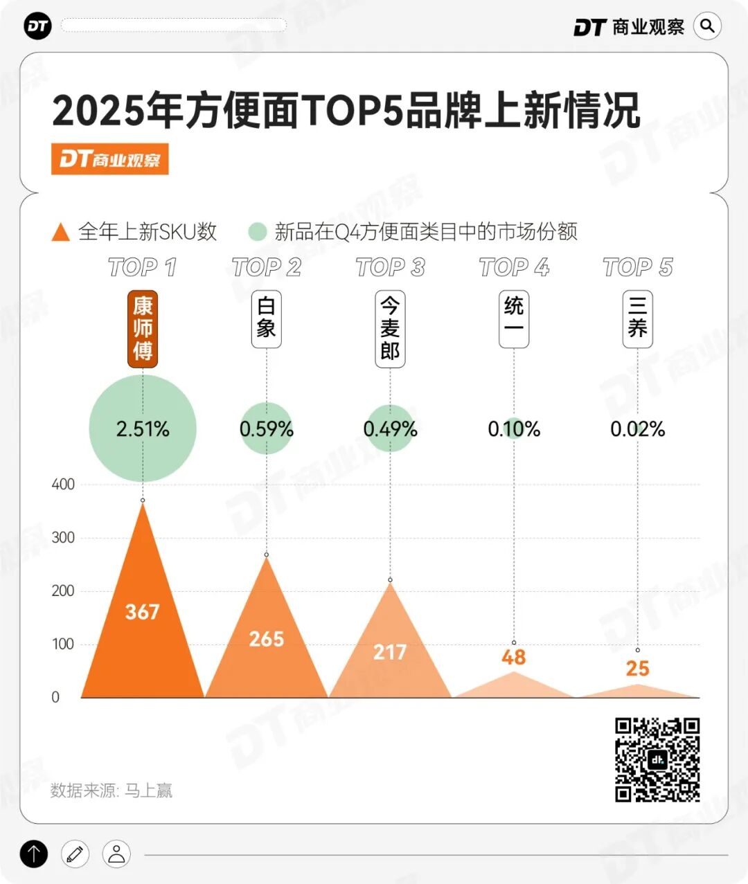 马上赢数据显示,2025年,康师傅是上新SKU最多的品牌,四季度新品在市场占比中进一步扩大到2.51%,这在一定程度上说明,康师傅新品不仅在数量上有优势,在市场反响与成长性上的领先更为显著。