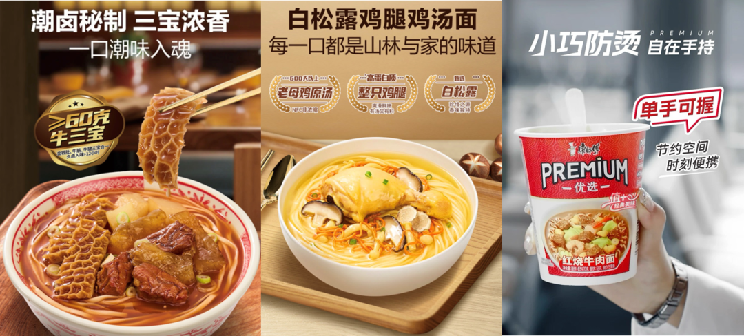 在口感与品质升级方面,则有特别特鲜泡面,主打更贴近堂食煮面的口感体验;合麵系列,凭借大块肉包、大片菜叶突出营养均衡;Premium系列采用免撒料杯与隔热包装提升食用体验,老母鸡汤面更通过锁鲜与工艺创新,最大程度还原鸡汤本味。
