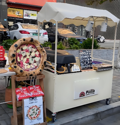 他打开后备箱,里面是一个定制的窑炉。揉面、撒料、送入,动作老练。在 400°C 的高温烘烤下,面团迅速膨胀,边缘泛起焦香。几分钟后,一份热腾腾的窑炉比萨递到了围观者的手中。