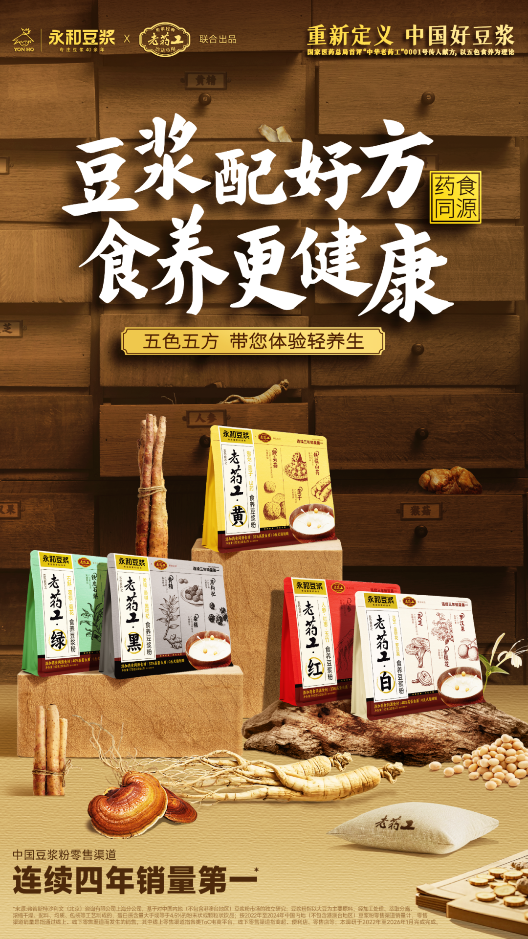 永和豆浆联合“中华老药工0001号喻伯藩”先生传人喻文定女士,推出老药工系列五色食养豆浆粉。