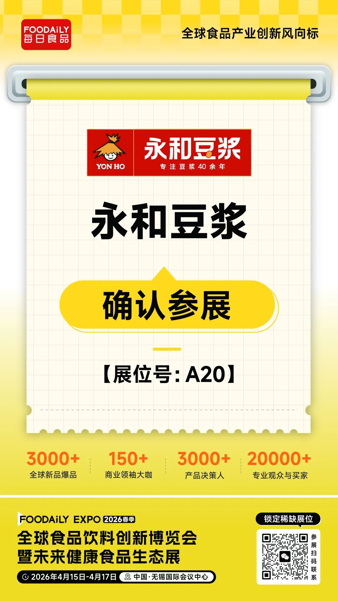 在众多参展力量中,展会迎来一则重要动态——国民豆浆领军品牌【永和豆浆】已正式确认参展!作为中国豆浆领域的引领者,永和豆浆的加入将为2026 Foodaily创新博览会带来更多优质植物蛋白饮品创新理念,与行业同仁共探豆浆品类创新发展之路!