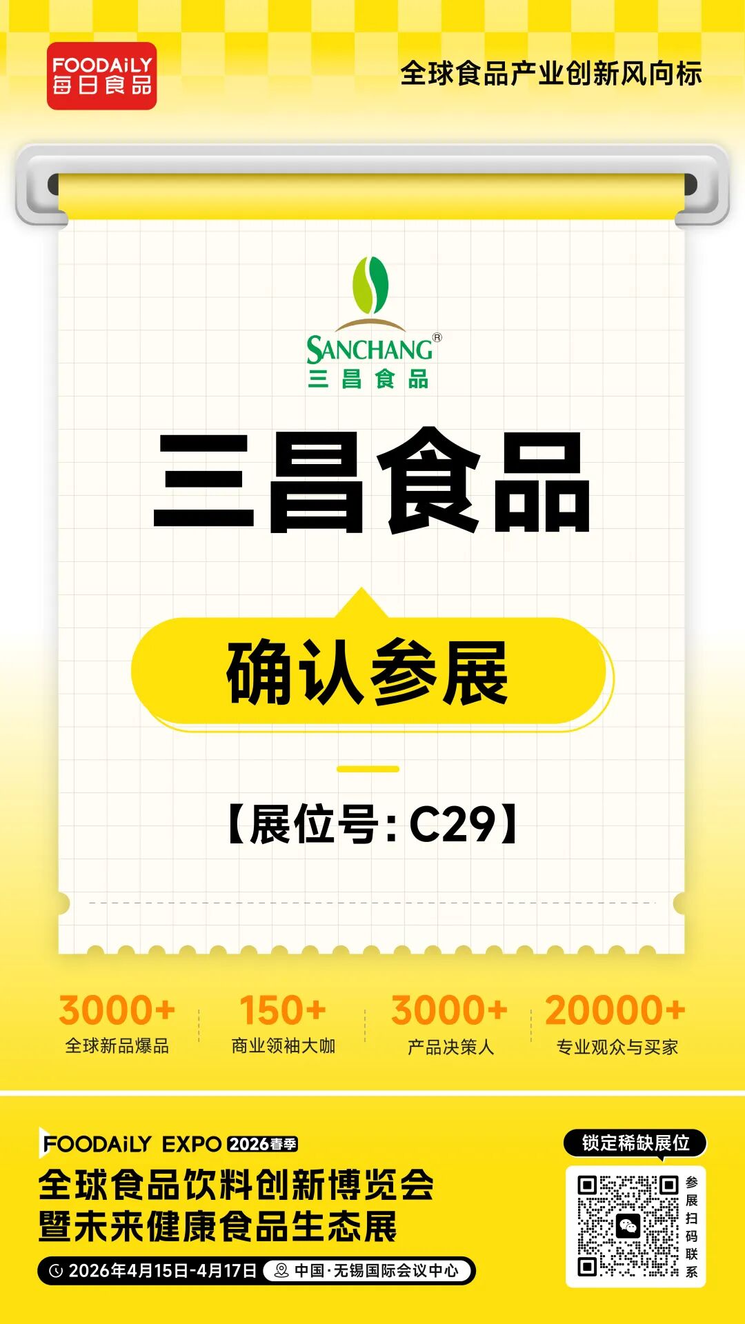 4月15日-17日,无锡国际会议中心,三昌食品期待与您相约2026Foodaily创新博览会现场!