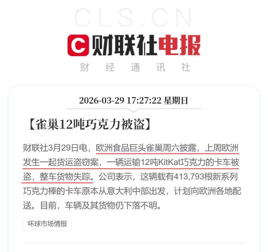 雀巢公司声明,这辆载有413793根新系列巧克力棒的卡车上周早些时候离开意大利生产工厂运往波兰后被盗。目前,货车及其货物仍然下落不明。