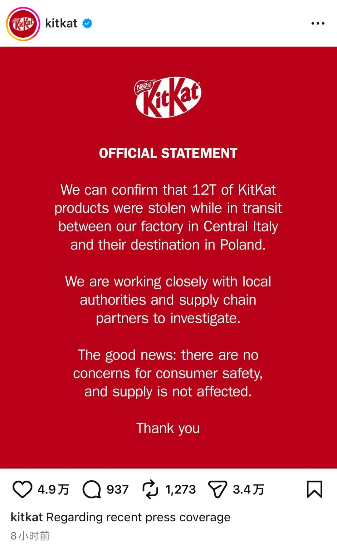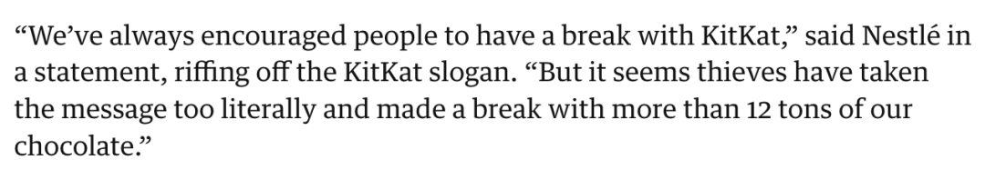 “我们一直鼓励大家偶尔吃点 KitKat 放松一下。但看来窃贼们把这句话理解得太字面意思了,偷走了超过12吨的KitKat巧克力。”