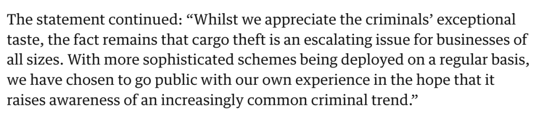 “虽然我们认可这些犯罪分子的品味确实非同一般,但事实是,货运盗窃对所有规模的企业来说都是一个日益严重的问题。”