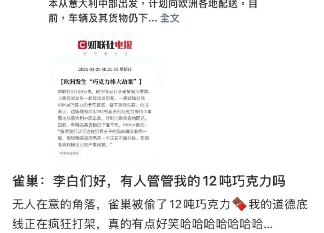 在内娱一片兵荒马乱的当下,在一个无人在意的角落,“雀巢被盗12吨巧克力”的消息幽幽划过……