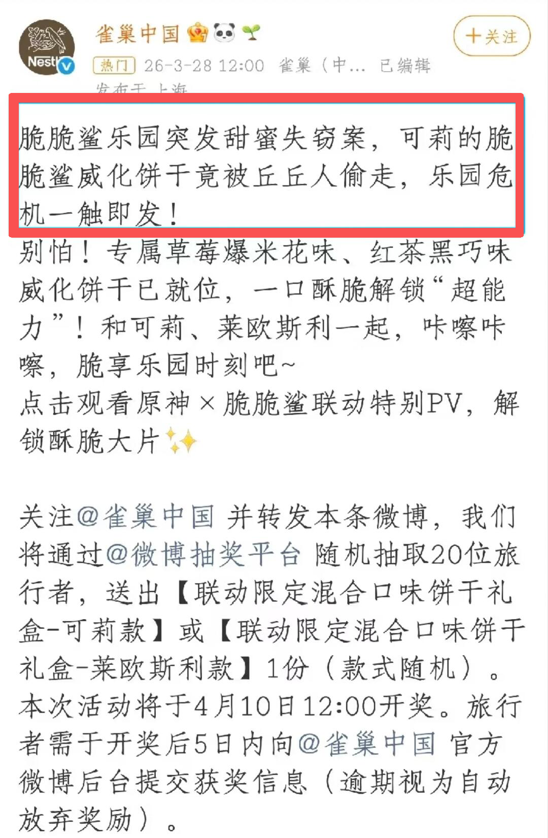 而此时,距离雀巢中国以“甜蜜失窃案”名义官宣原神x脆脆鲨联名,仅过去1天。
