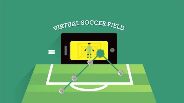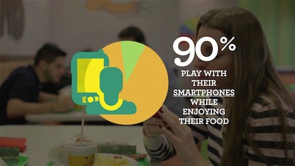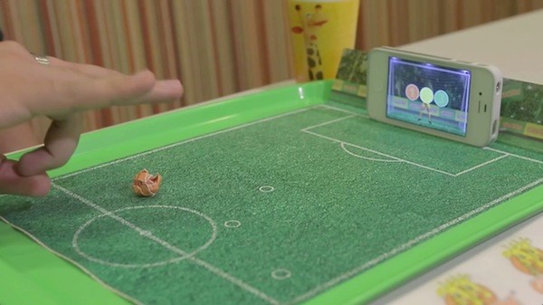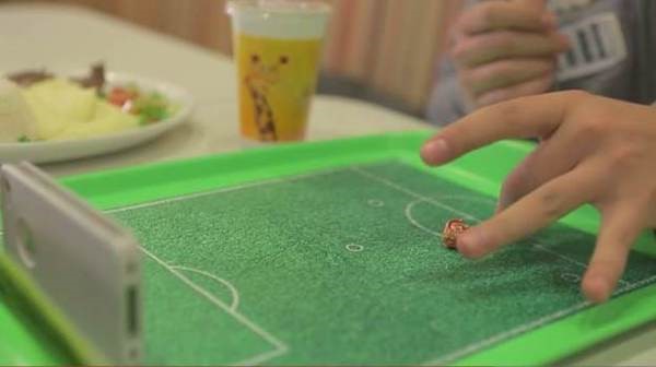 有 90% 的人会在餐厅等位或用餐间隙玩耍手机,巴西连锁快餐品牌 Giraffas 对前来用餐的消费者开展行为调研后得出这一数据,并由此开发了一项结合手机与 2014 巴西世界杯主题的足球餐盘互动项目。它包含一张设计成足球场的餐盘纸和能撕下捏成小球的侧边纸条,消费者在下载一个免费的配套 app 后,将手机摆放在餐盘一边,前置摄像头将捕捉纸球运动轨迹,从而决定是否进球得分,即刻就可开展点球大战。
