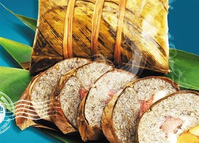 馅料:用草木灰、芝麻油、火麻油调制成秘制香料,配上板栗、五花肉、糯米、绿豆。