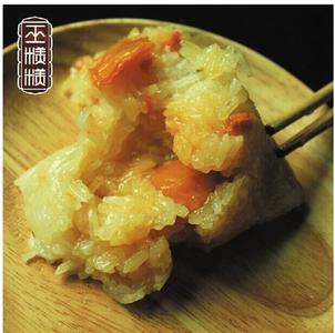 馅料:糯米、香菇、红烧肉、咸蛋黄、干虾仁、干贝、鱿鱼干、蚝干。