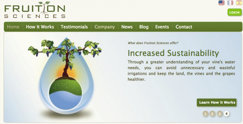 Fruition Sciences技术能帮助酿酒师们做出关于葡萄养植的关键性决定,比如灌溉多少水、什么时候灌溉。这一新技术的传感器能够分析葡萄藤中水分的需求,并且当葡萄藤的水分过多或不足时将信息以文本的形式发送给酿酒师。使用这一新技术软件,酿酒师们可以监控天气的环境,湿度和风速并且根据这些因素做出灌溉的决定。一位思福葡萄园早期的葡萄种植员估计,因为使用了这一新技术的监测传感器和软件,去年园中节约了160,000加仑的水。Fruition Sciences技术也可以应用于如番茄和鳄梨的农作物上,这一技术正在全加利福尼亚的农田中试验。