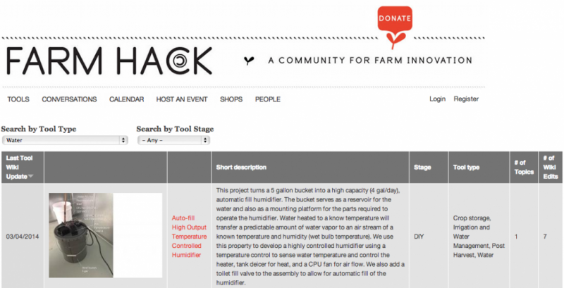 农场黑客为弹性的可持续的农业主办活动,并提供一个网络平台来培养农场工具的开发、记录和制造。去年十一月,这个组织主办了一场农场黑客的干旱复原活动,结果发展了两家在线维基:一个能为农业恢复需求提供新想法的工具,一个能让农民们分享与农业有关的信息、农场实践和故事的虚拟“咖啡店”。在它们的维基工具中也有许多与水有关的技术的资源开源计划。