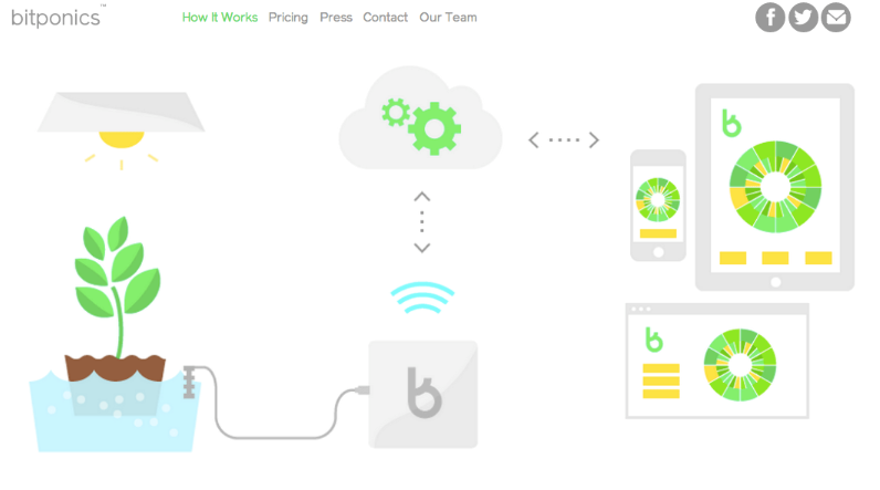 Bitponics公司提供了一项私人花园服务。它的装置和网络服务使水培花园自动化,简单化和社会化,并且提供一步一步的种植路线图,即一项种植计划。这个装置的传感器监测你的花园健康状况并且将数据即时发送给Bitponics云端。这个云端能控制你花园种植的植物,自动与存储器连接,如灯和水泵,并且当你需要做出改变或行动时提醒你。Bitponics的社会结构使得你能够将你种植的植物分享给社区花园并交换秘诀和见解。