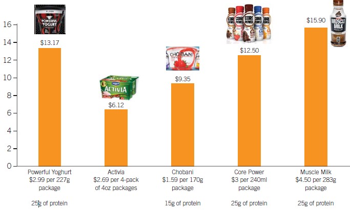 以相等体积的高蛋白饮料为基础生产出的POWERFUL酸奶定价理所应当的高于蛋白酸奶(Chobani)和主导地位的益生菌酸奶(达能Activia)。