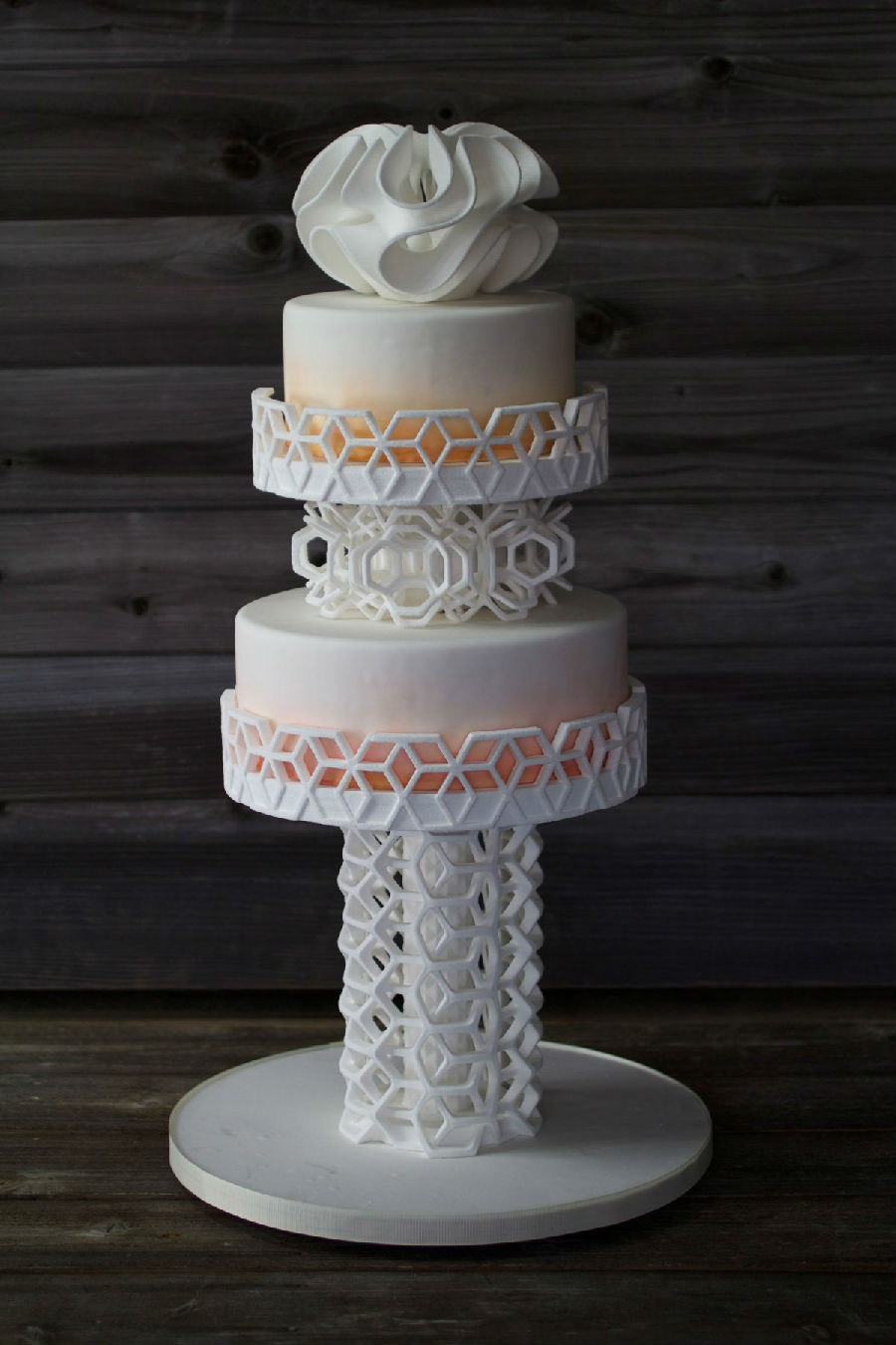 现在用白糖打印的产品已经远远超过了糖果实验室原先打印的糖果。“我们已经进行了各种尝试,从饮料甜味剂到精致的婚礼蛋糕上的复杂裱花。” von Hasseln说,“我们甚至已经做了一个婚礼蛋糕了。”当你打印出3D的糖霜,它就已经是构成甜品的一部分而不仅仅是一种装饰了。”