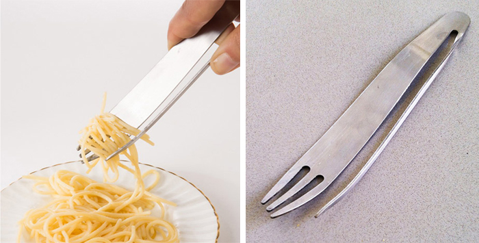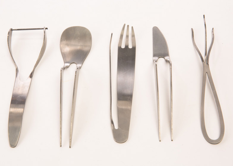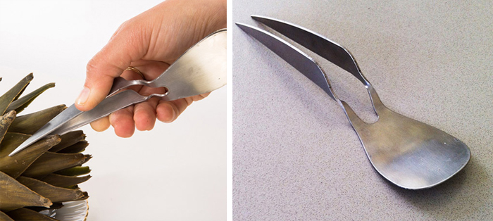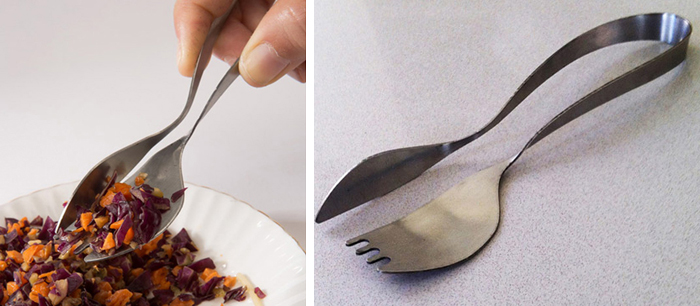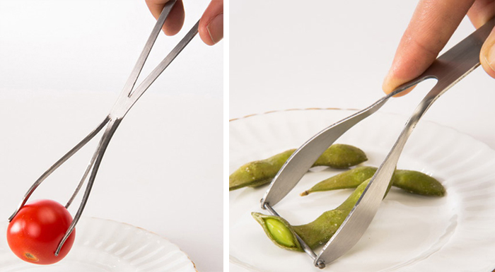 在以色列设计师 Lee Ben David 看来,不管是勺子还是叉子,应对某些食物来说,功能都太单一化。于是,她用不锈钢制成了一套混合餐具。从土豆削皮器得来的灵感,让吃毛豆不再用手;夹子和叉子结合起来,就不必担心滑溜的意大利面了;吃圣女果有专用的三脚夹;而在自助餐会上,一边是铲子一边是夹子的器具可以解决洋蓟的剥食问题。