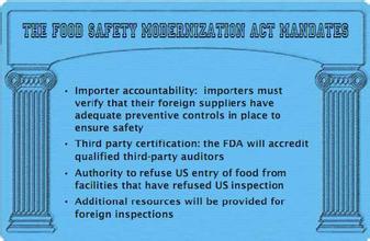 自从《食品安全现代化法》在2011年1月被签署成为法律,美国FDA已经提出七项实施《食品安全现代化法》的规定。本四项提议修改规定包括:农产品安全;人类食品防范性控制;动物食品防范性控制和外国供应商鉴别项目。