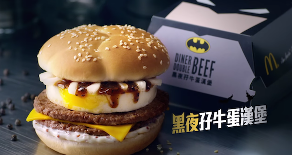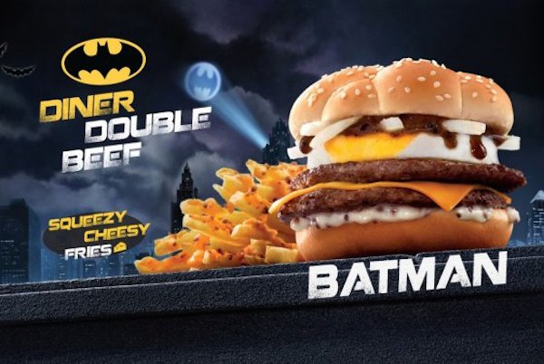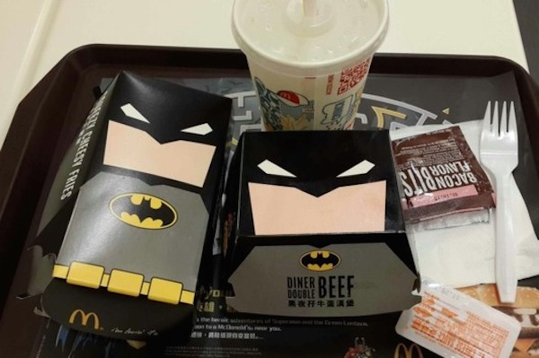 麦当劳日前在香港带来一款蝙蝠侠汉堡,同时还推出了作为搭配的唧唧芝士薯条和青苹果苏打茶。这款蝙蝠侠汉堡内有两块肉饼、煎鸡蛋、葱与酱汁,外则有蝙蝠侠特别包装呈现。而麦当劳也为之推出了一则宣传广告,超级英雄蝙蝠侠自然也有亮相。最新广告:http://v.youku.com/v_show/id_XNzk0NjY2OTEy/v.swf.html