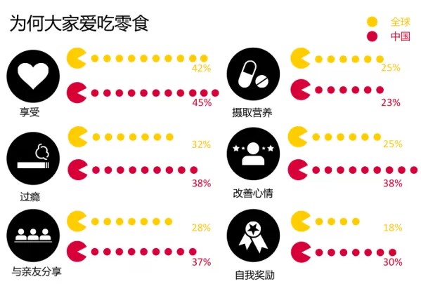 不得不提及的是,相比过去,今天的中国消费者面对的是压力更大、节奏更快的生活,因此,较全球消费者而言,中国消费者更愿意通过消费来为自己的生活带来新鲜感,注入新的活力。折射在零食市场中,更多的中国消费者(30%)更愿意将享受零食作为一种对自己辛苦工作的犒赏(30% vs.全球平均18%),或是紧张工作中的一次小小的放松(24% vs. 全球平均18%)。