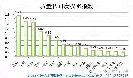 《报告》显示:在质量认可度榜单中,雀巢不仅受到了消费者在口感上的认可,其牛奶用在调咖啡、做酸奶和冰淇淋等其他方面的用处,也受到消费者的广大认可,故在质量认可度榜单中成绩最高。紧随其后的是光明和伊利,而蒙牛遗憾跌出三甲。