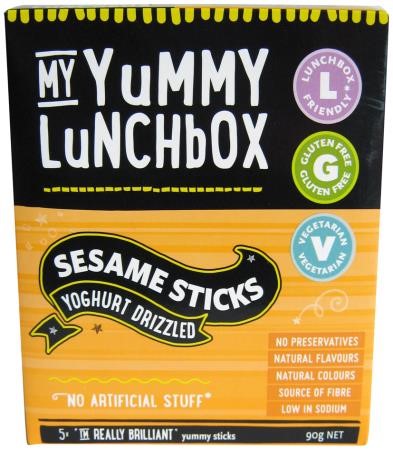 3、My Yummy Lunchbox(美味午餐盒):酸奶芝麻棒(澳大利亚)。全天然美味。无人工配料。没有人工香料、色素或防腐剂。能够补充纤维。适合素食者。低钠。饭盒友好——不含坚果。无麸质。