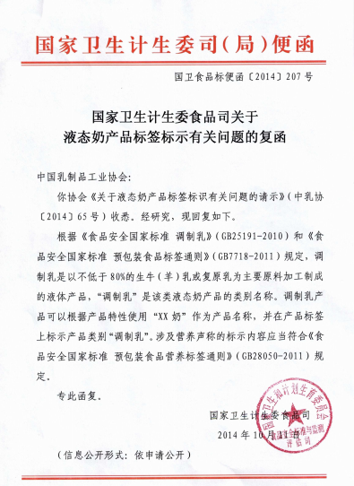图为国家卫生计生委食品司关于液态奶产品标签标示有关问题的复函。