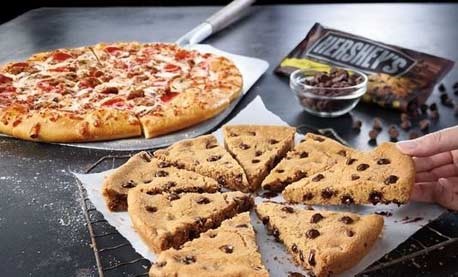 披萨搭配的当然是薯条和碳酸饮料或啤酒啦!但是美国必胜客在本月推出了和披萨饼一样大小的巧克力曲奇饼干!你搭配的可能是一杯热巧克力奶了,这简直是甜食爱好者的心头好!