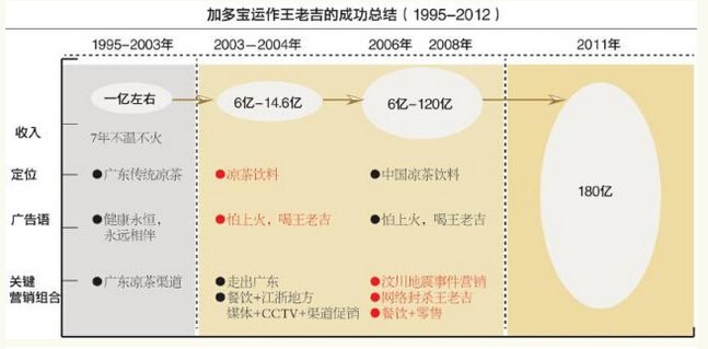 此外,王老吉蹿红也与时机有关。2003年赶上非典,2008年遭遇汶川地震,而这正是王老吉两次关键崛起的时间,制造一些事件营销话题,引爆市场。