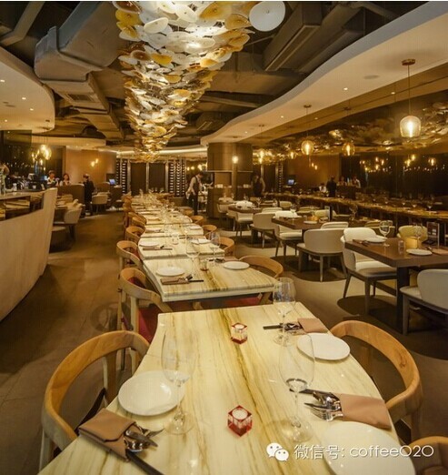 餐厅的空间狭长,设计的时候可以避免因狭长而产生的纵深感,以定制的蘑菇龙灯(mushroon dragon light)为主要元素,808块玻璃片都是按蘑菇状吹制出来,再一片片手工安装上去,下面的桌子以整块大理石配合灯的弧度切割成一串两人座,可以根据人数灵活调整,拼在一起则纹路可以自然衔接,可以说完全为这个空间定制。