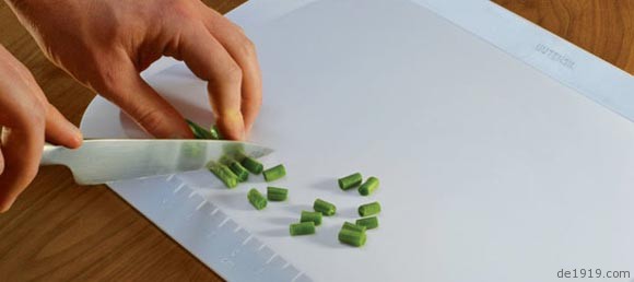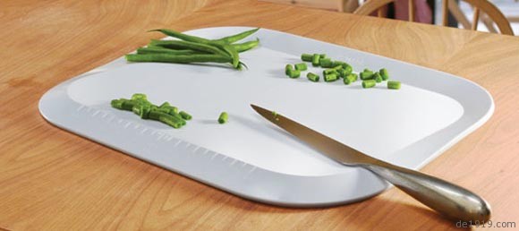 这是一款极其方便的切菜板,切菜板的板身有着一个倾斜的角度,并且一边的边缘处翘起,这样就能很轻松的将切好的菜集在一起,并倒入锅中,同时也能不让食材的汁水流淌到桌面上。在切菜板的另一边还有着尺子一般的刻度,能让使用者按照尺寸切菜。这么方便的切菜板,家里掌厨的那位一定很喜欢吧!