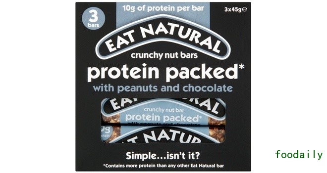Eat Natural公司的这款富含蛋白质的零食产品中含有花生、椰子、大豆、蜂蜜、黑巧克力,每条45g的零食产品中含有10g蛋白质。