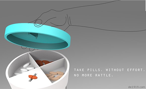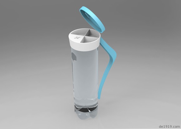 吃药的时候最麻烦的就是没有合适温度的水喝,甚至有时候夜里紧急情况需要吃药,没有水。贴心的设计师设计了这款药+水瓶,药品也在水瓶盖上进行了分类,只要把一天的药片放好,倒好水在杯子里,需要的时候拿来即可!
