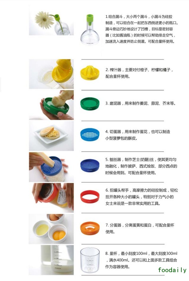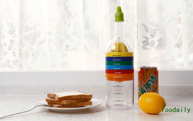 在这个处处都要靠外貌取胜的年代,这套看起来像一只漂亮瓶子的厨房工具套装显然是赢了。色彩斑斓的漂亮外表之内,包含了漏斗、柠檬榨汁器、磨泥器、切蛋器、刨丝器、扭罐头帮手、蛋黄分离器和量杯,用的时候是功能强大的一堆工具,不用的时候只是一个安静的漂亮瓶子。你喜欢吗?