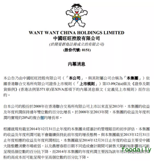 然而,时隔2天之后,也就是今天(2月9日)早上7点多,小编第一时间独家获悉,旺旺集团在资本信息披露网站上刊发了一则“内幕消息”,对其将要发布的2014年度财报中涉及的销售业绩情况予以了预披露,显示其2014年营收及利润可能出现个位数下滑,该内幕消息原文截图如下: