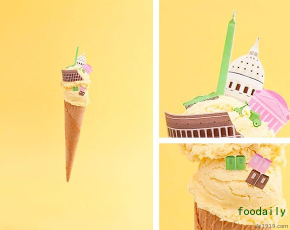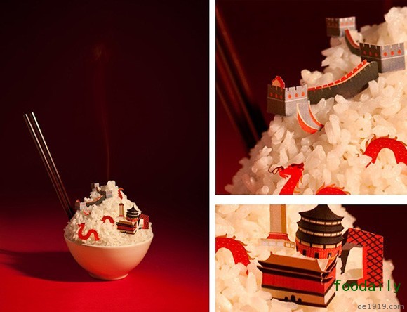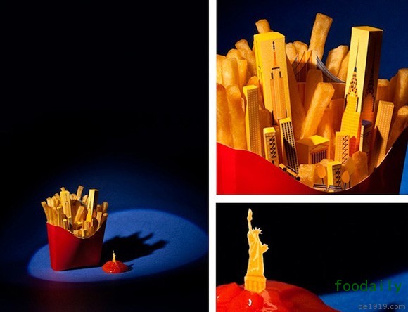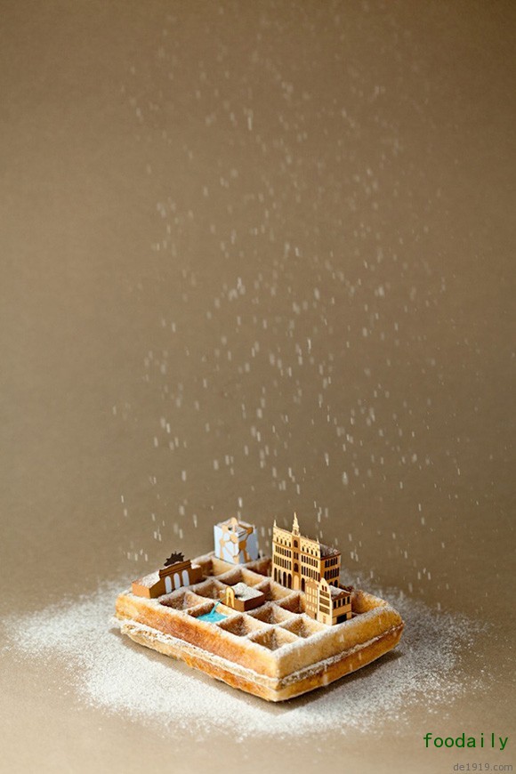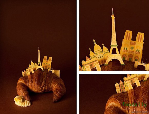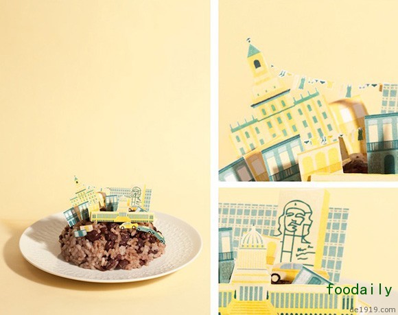 Bea Crespo和Andrea G. Portoles’是一组非常好的伙伴。一个插画师,一个是摄影师。Bea Crespo用插画的形式表现很多的古典的建筑等图画,做成纸制模型与食物相结合,由Andrea G. Portoles’进行摄影,从不同的情景中阐释不一样的食物也阐释不一样的风景!