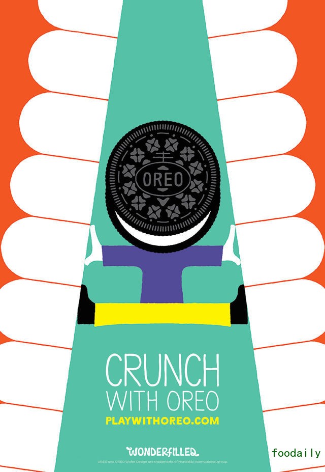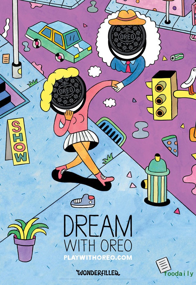 对于奥利奥这个品牌来说,最具代表性的标志就是那一块 2 合 1 的黑色夹心饼干了,奥利奥也没少用这些黑色小圆圈来做文章,比如在 2012 年为了庆祝自己的一百岁生日,就用他们做了一个百周年大事记。而在最近,这个品牌与广告公司 The Martin Agency 联手,找来了 10 位艺术家,以奥利奥饼干为元素创作了一系列插画,一如既往,充满了童趣的可爱色彩。
