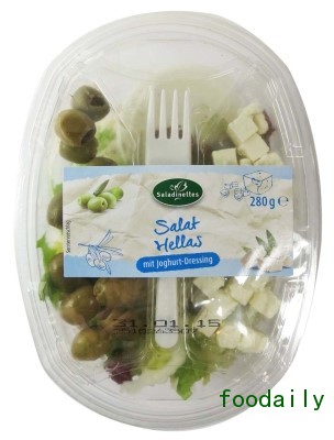 9、Saladinettes Salat Hellas Mit Joghurt-Dressing:酸奶调味的预制赫拉斯沙拉(德国)。含绿橄榄和希腊风格奶酪及单独的酸奶风味调料的预制赫拉斯沙拉。