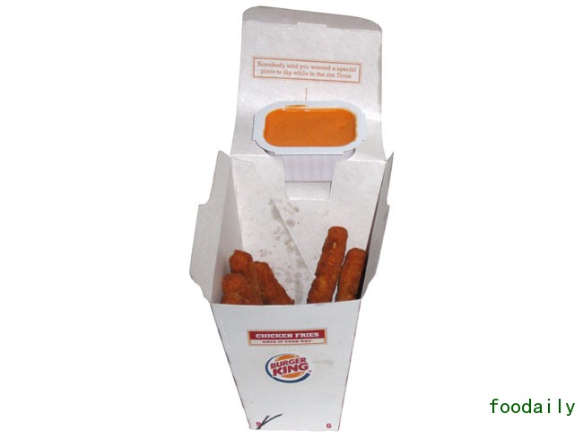 麦当劳当然不是第一个在外带包装上玩花样的快餐品牌,这里是汉堡王炸鸡薯条的包装,黏在上端的蘸酱盒帮顾客解决了“不知道放哪里好”的问题: