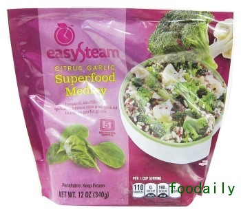 3.Easy Steam:柑橘大蒜味超级食品杂烩(美国)。用柑橘大蒜对西兰花(绿)、花椰菜(白)、菠菜、糙米和藜麦进行涂抹调味。
