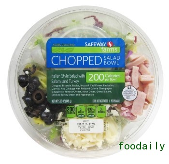 4. Safeway Farms:碗装沙拉:意大利腊肠和火鸡搭配意式沙拉(美国)。切碎的莴苣菜、苦苣、西兰花、花椰菜、菊苣、胡萝卜、红球甘蓝,搭配低热量的香槟油醋汁、方提娜干酪、黑橄榄、热那亚意大利腊肠、烟熏火鸡胸肉和希腊金椒。