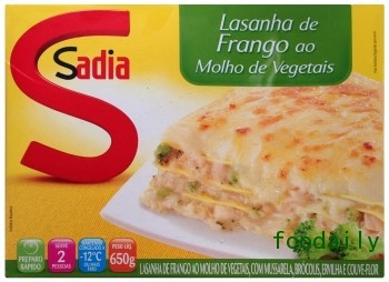 7.Sadia:蔬菜酱汁鸡肉焗烤千层面(巴西)。冷冻面条搭配鸡肉和蔬菜酱汁、马苏里拉干酪、西兰花、豌豆和花椰菜。