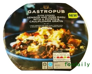 9.Marks And Spencer Gastropub :煨煮鹿肉和猪肉搭配奶油焗烤土豆和花椰菜(英国)。丰富的鹿肉、猪肉、红葡萄酒并浇上红葡萄酒肉酱汁,再搭配混有土豆和花椰菜的奶油芝士酱并撒上面包屑