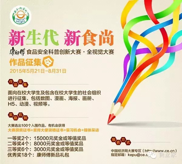 钟爱方便面的你我恐怕对于此类“现代化的食品加工安全知识”也是知之甚少的。为此康师傅独创“康师傅食品安全科普创新大赛•全视觉大赛”活动,征集食品安全宣传视觉化作品,更设置高达8万元的赛事奖金。