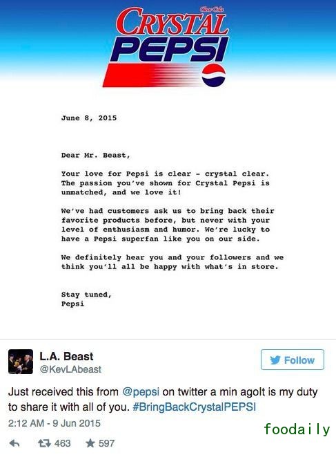 你应该没有喝过这个叫水晶百事 Crystal Pepsi 的饮料,事实上这个传说中的可乐主要是在 1992 年至 1993 年的北美市场出现的。不过根据百事公司最近回复给水晶可乐爱好者 Kevin Strahle 的一封信,这个复古款的饮料可能要重出江湖了。