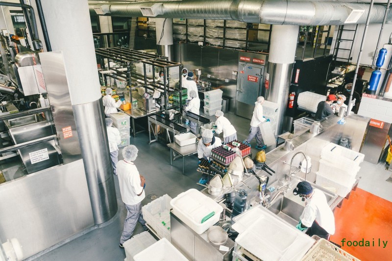 在距离计数器大约二层楼高的位置有一组工作人员正在将成堆的甘蓝压进一个大型的榨汁机中。一个工作人员用一根巨大的棍子将生菜塞进榨汁机中,其他的人则张开一个布袋接收浆料。在拐角处水龙头喷的下方,有一个大型的传送带负责传送水果和蔬菜,其每天的运输量可达15,000磅。这里有被龙舌兰纸箱塞满的橱柜,而里面的储物间则看起来想有人抢劫了好市多超市一样。