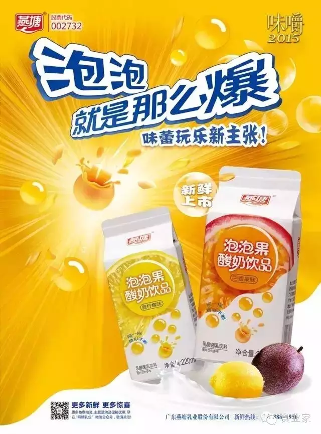 以上是燕塘乳业为此次新品上市造势的宣传海报,从海报上我们能看出,燕塘乳业这次的新品除了想玩儿颠覆之外,还特别加入了“爱尝鲜”任性玩乐的趣味元素。那么对于这家广东本土唯一上市乳企来说,新的产品究竟会是什么,“味嚼2015”又是什么意思呢?